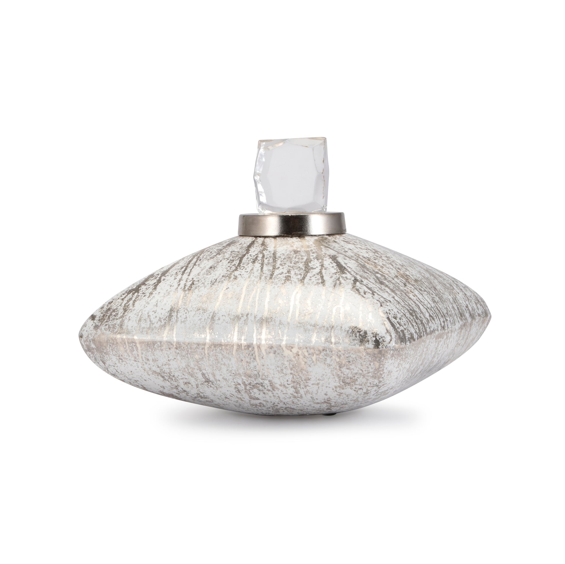 This beautiful reactive glaze glass bottle with metallic patterns can be used to create a distinct look to any room.