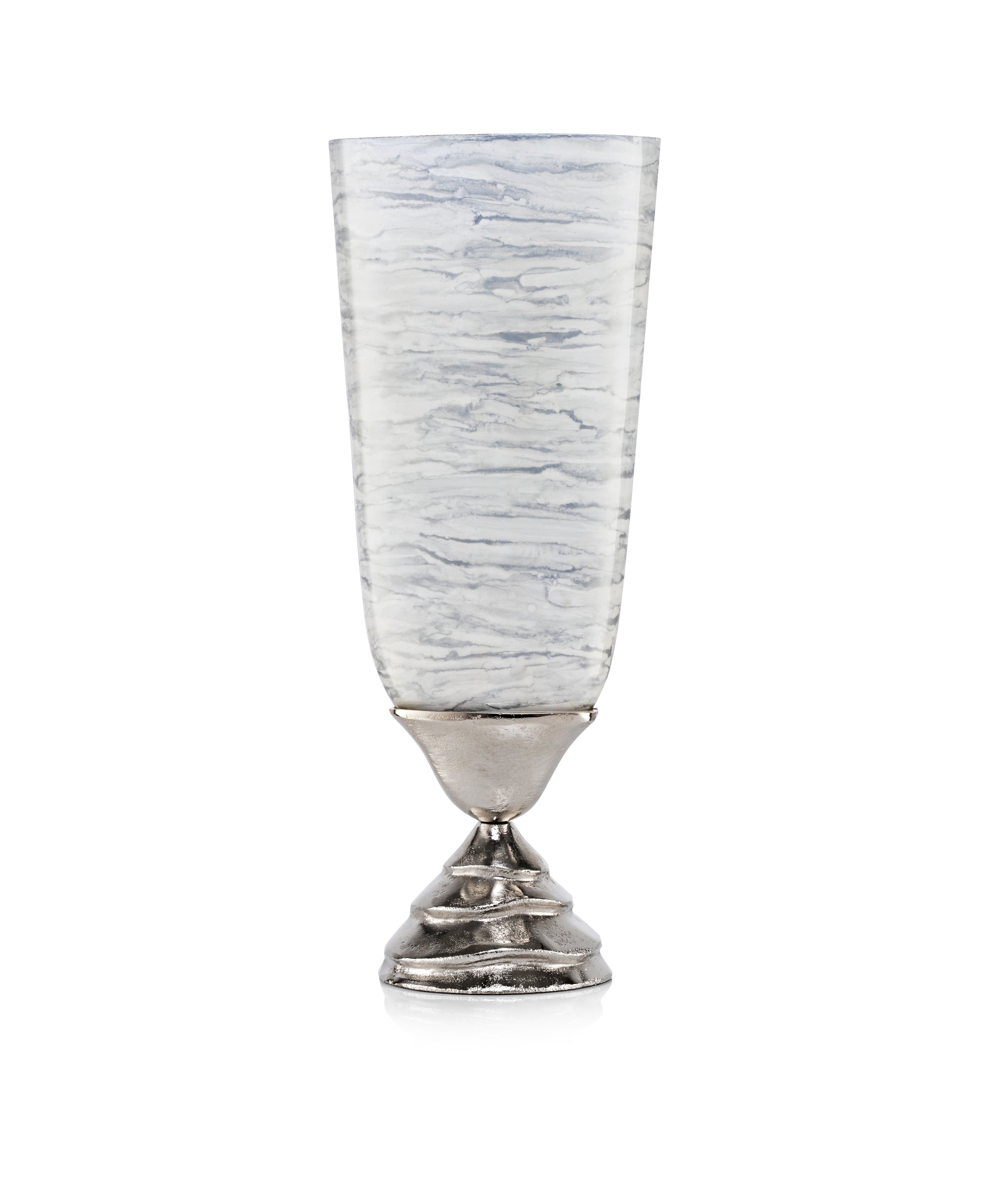 This hand blown glass decorative glass with metallic patterns create a distinct look in any part of your home. Display as an accent piece or fill with wild or occasional flowers. Inspired by blizzard storms, this glass vase is a beautiful addition to your home.